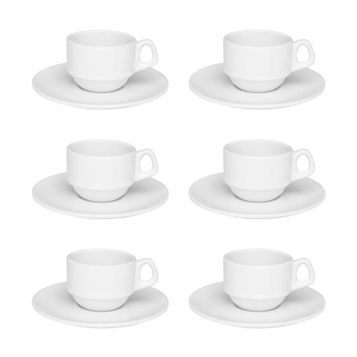 Conjunto elegante com 6 xícaras pequenas de 75 ml acompanhadas de pires. Design empilhável que otimiza o espaço de armazenamento na cozinha ou na cristaleira. Perfeito para servir café, chá ou bebidas quentes em ocasiões especiais ou no dia a dia. Material cerâmico de qualidade garante durabilidade e acabamento refinado. Ideal para presentear ou complementar sua coleção de louças.